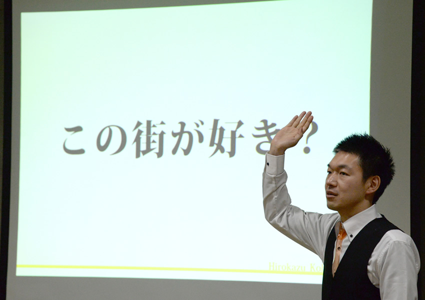 コピーライターである小林氏は、街の見方を変えることで新たな良さを発見し、 他人に楽しく伝えるためのワークショップを開催した。本講座をきっかけに多数の地域イベント参加する中で、より日常に溶け込む形でイベントの企画ができないかと考え、本企画に至った。今回の報告に間に合わせるため、わずか1週間の準備期間の中で、新聞折り込みで3,000部チラシを配布し、HPを立ち上げ、実施にこぎつけた。 しかしフタを開けてみると参加者はたった一人!学びの多い実践だったと語る。会場からは実行力に驚きの声が上がった。