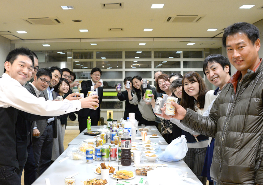 ▲報告会後は商店街のお惣菜を囲んで乾杯!一期・二期・事務局・区職員の垣根を越えて、イベント談義に花を咲かせる夜となった。