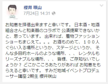 たまたまフェイスブックで見つけた“すみだ地域イベントプロデューサー講座(イベプロ)”に「演奏会・イベント企画の参考になる話が聞けるかも!」と思い応募した。 受講がきっかけで、すみだJAZZストリートフェスティバルや河内音頭などに参加し、出身地や居住地を超えて こんなにも地元すみだに愛着を持って活動する人がいることに刺激を受けているという。